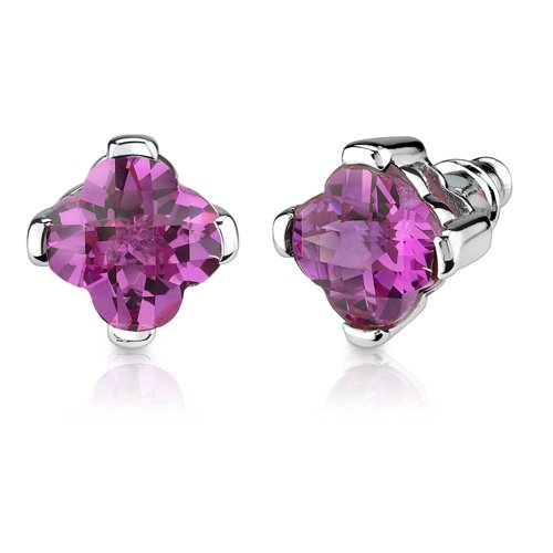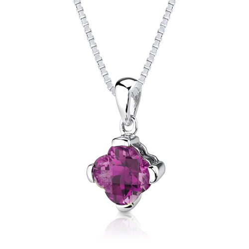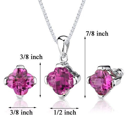 Earrings = Created Pink Sapphire, 2 pieces Checkerboard-cut Lily Shape 9mm, total weight 4.25 carats. Earring Dimension: 3/8 x 3/8 inches. Pendant = Created Pink Sapphire, 1 piece Checkerboard-cut Lily Shape 10mm, total weight 6.00 carats. Pendant Dimensions: 7/8 x 1/2 inches. Earrings and Pendant have a total weight of 8.60 grams and are set in pure.925 Sterling Silver Rhodium Nickel Finish. Includes a 18" Sterling Silver Rhodium Nickel Finish Box Chain, Free Gift.Feature