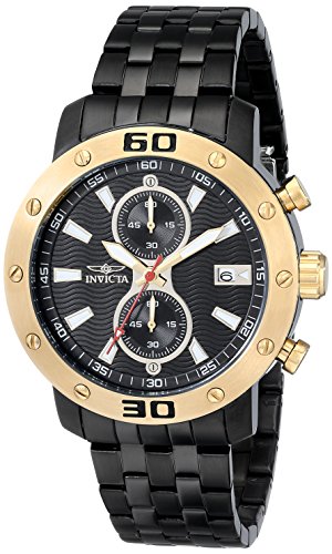 -. Binding : Watch -. Brand : Invicta -. Color : black -. Department : mens -. EAN : 0886678222308 -. Feature : Chronograph functions with 60 second and 60 minute sub dials; date window at 3:00 / Black textured dial with gold tone, white and red hands, gold tone and white hour markers; luminous; 18k gold ion-plated stainless steel bezel; 18k gold ion-plated stainless steel crown and pushers; flame fusion crystal; black ion-plated stainless steel case and bracelet / Japanese-quartz movement / Case diameter: 45mm / Water resistant to 330 feet -. Label : Invicta -. Manufacturer : Invicta -. Model : 18022 -. MPN : 18022 -. PackageQuantity : 1 -. PartNumber : 18022 -. ProductGroup : Watch -. ProductTypeName : WATCH -. Publisher : Invicta -. Studio : Invicta -. Title : Invicta Men's 18022 Specialty Analog Display Japanese Quartz Black Watch -. UPC : 886678222308