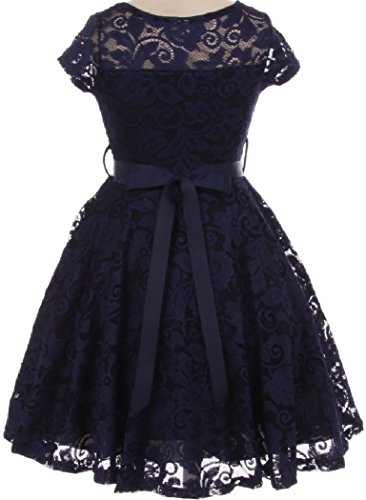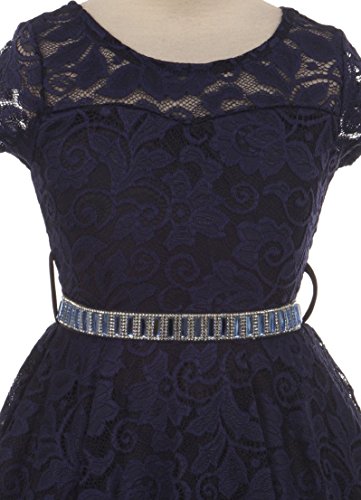 Big Girl Cap Sleeve Lace Skater Stone Belt Flower Girls Dresses (19JK88S) Navy 8