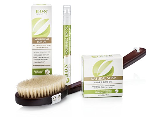 B.O.N Nourishing Skin Oil is a blend of Avocado Oil, Rosehip Oil, Grapeseed Oil and added Vitamin E Oil. It is clinically-proven, natural and effective skin care.It absorbs quickly and greaselessly to soothe itchy, dry, stretched skin, leaving it feeling soft and tone especially after the stimulation and dead skin removal from dry body brushing.Practical and thoughtful gift for
