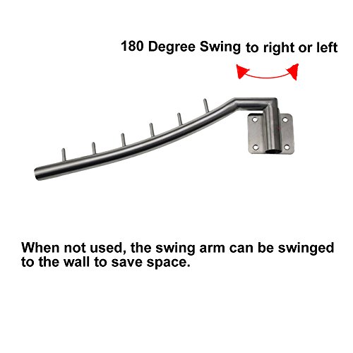 -. Binding : Kitchen -. Brand : Ideemoor -. Color : stainless steel brushed -. EAN : 0612957078423 -. Feature : Made of high quality stainless steel 304 material and brushed finish to resist daily scratches and corrosion. / Swivel bar hanger. 180 degree swingable. The hanger arm can be swinged left or right to wall when not in use to save space. / Very nice and convenient way to keep the clutter under control: It has six little prongs that give you separated places to hang your items. You could hang umbrellas, purses, and hats from this besides clothes. / Ideal for use in bedrooms, bathrooms, and closets for clothes storage & organizer. / Package comes with matched install fittings and easy to install. -. IsAutographed : 0 -. Label : Ideemoor -. Manufacturer : Ideemoor -. Model : IM065-A -. MPN : IM065-A -. PackageQuantity : 1 -. PartNumber : IM065-A -. ProductGroup : Home -. ProductTypeName : HOME -. Publisher : Ideemoor -. Size : 12.6" Length -. Studio : Ideemoor -. Title : Swing Arm Wall Mounted Clothes Hanger Stainless Steel Closet Storage Organizer Holder Rack Hanging System 2x -. UPC : 612957078423