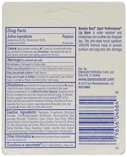 Banana Boat Sport Performance Lip Balm is very water and sweat resistant and keeps your lips moisturized. This ultra-sheer formula with patented AvoTriplex technology protects in 3 ways: 1. Against sunburn with high UVB protection, 2. Against the effects of aging and long-term skin damage with high UVA protection, and 3. Lasts longer than ordinary sunscreens since it doesn't break down.Feature