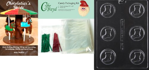 Cybrtrayd Stocking Cookie Chocolate Mold with Chocolatier's Bundle of 50 Cello Bags, 25 Green and 25 Red Twist Ties and Chocolatier's Guide