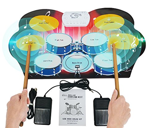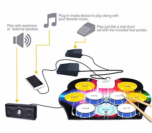 Electronic Roll Up Drum Kit Silicon Foldable with Record Function with Drum Sticks Foot Pedals for Drum Kit Learners and Kids By Vafoream