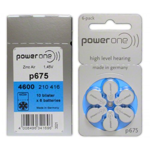 -. Binding : Health and Beauty -. Brand : Power One -. EAN : 4043752177381 -. Feature : Mercury Free / Quality seal on back ensures that the batteries have not been tampered with. / Long lasting with an extra long tab to facilitate easy handling. -. Label : Varta -. LegalDisclaimer : As with any "zinc-air" hearing aid battery that is "air activated", it is highly recommended that you wait at least 60 seconds after you remove the Protective Tab before turning on your hearing aid. This will activate the battery and you will get the most out of it. These items are not refundable once opened. You know you are buying safe, original replacement parts. Thank you. -. Manufacturer : Varta -. Model : p675 -. MPN : p675 -. NumberOfItems : 60 -. PackageQuantity : 60 -. PartNumber : p675 -. ProductGroup : Health and Beauty -. ProductTypeName : HEALTH_PERSONAL_CARE -. Publisher : Varta -. Studio : Varta -. Title : Power One Size 675 MERCURY FREE Hearing Aid Batteries (60 batteries)