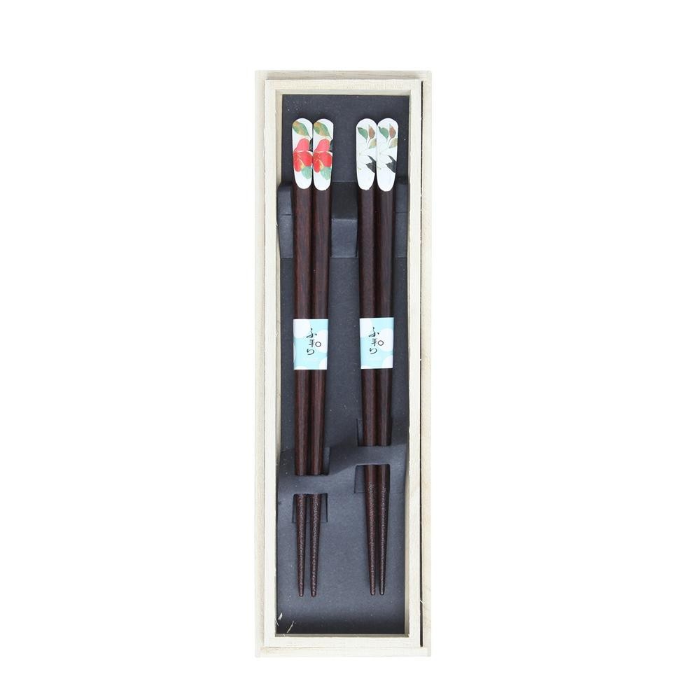 天然木の温かみと鮮やかに描かれた山茶花と木蓮が華やかな木箱入り箸のペアセットです。