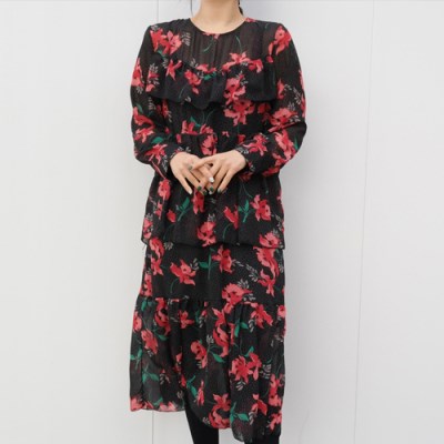 화사한 컬러감이 돋보이는 쉬폰원피스예요. 블랙바탕에 레드 플라워패턴이 프린팅되어 얼굴을 환하면서 화사한 느낌을 주었어요!