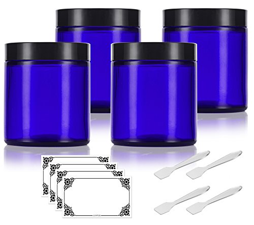 Cobalt Blue Glass Straight Sided Jars - 4 oz / 120​ ​ml (​4 pack) + Spatulas and Labels