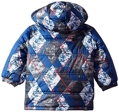 Two piece snowsuit set with contrast color diamond all over print on jacket. Exposed pop color zipper and solid color block detail at sleeves.