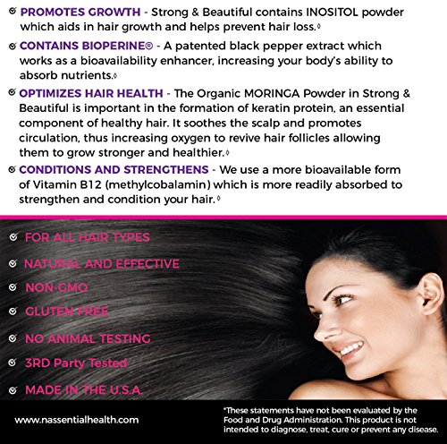 MOST POTENT FORMULA - Nassential Health has added patented BioPerine (2.5mg per serving) for increased absorption and bioavailability. Please compare our advanced formula with the competition. We believe we have scientifically formulated the most effective hair growth multivitamin available today. Utilizing the continuing science of hair care, we developed Strong and Beautiful to maximize your hair health and to give your hair what it needs.