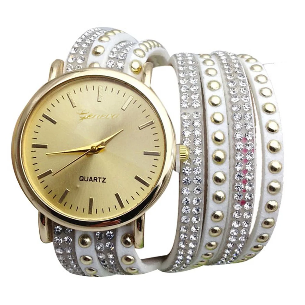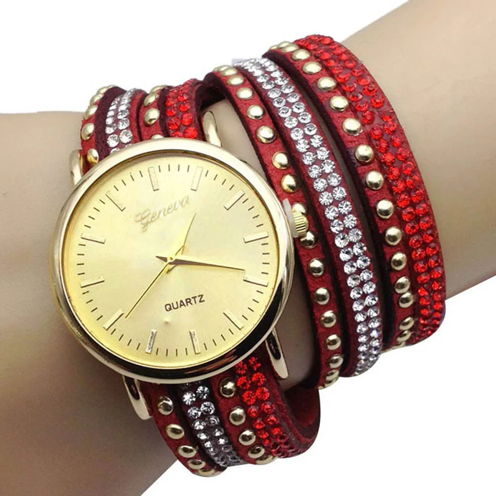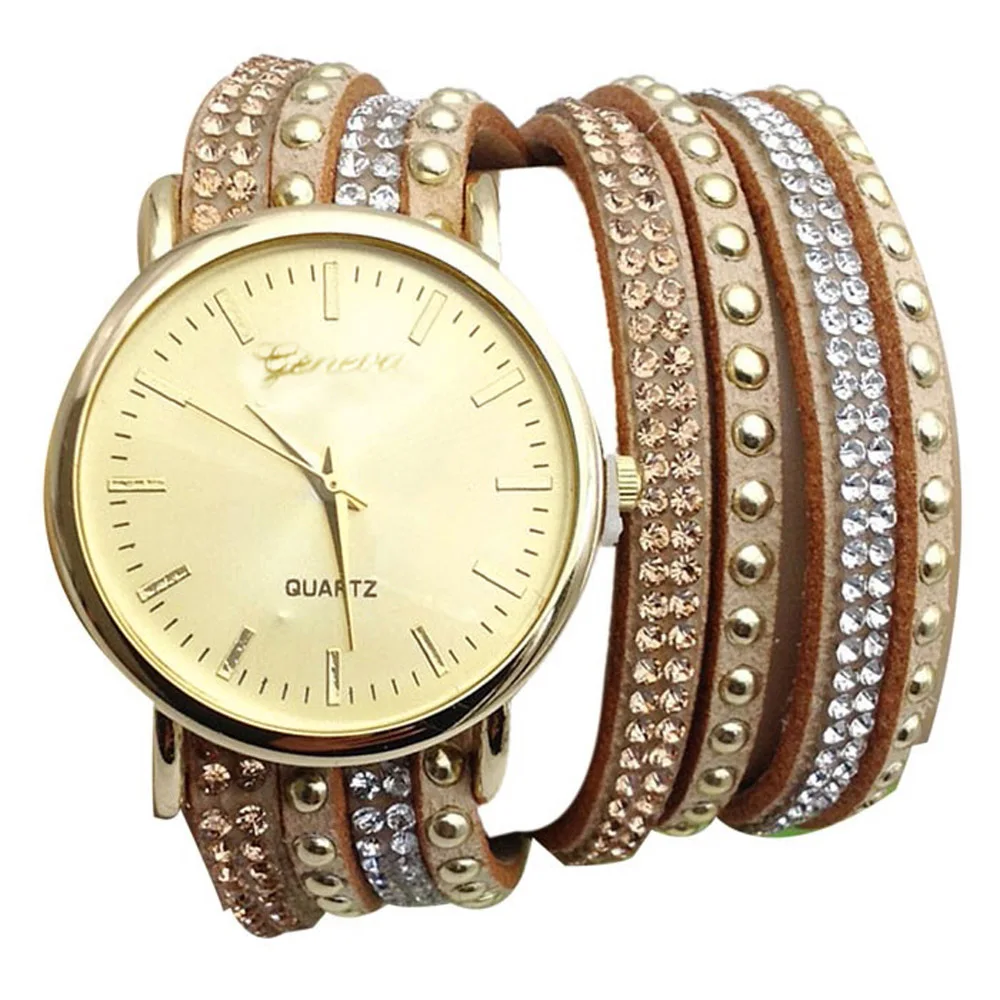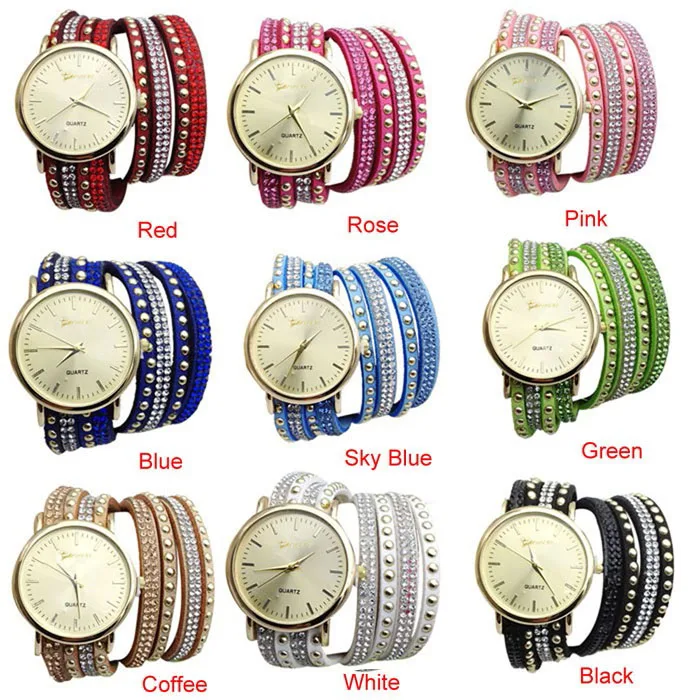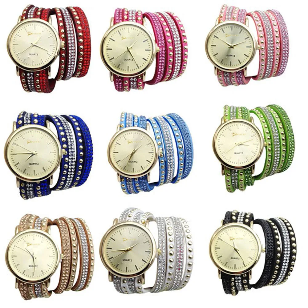 | [해외] 우수한 품질 9 새로운 캐주얼 여성 시계 PU 가죽 한국어 크리스탈 리벳 팔찌 시계 여자 여성 시계 마르 14 |
