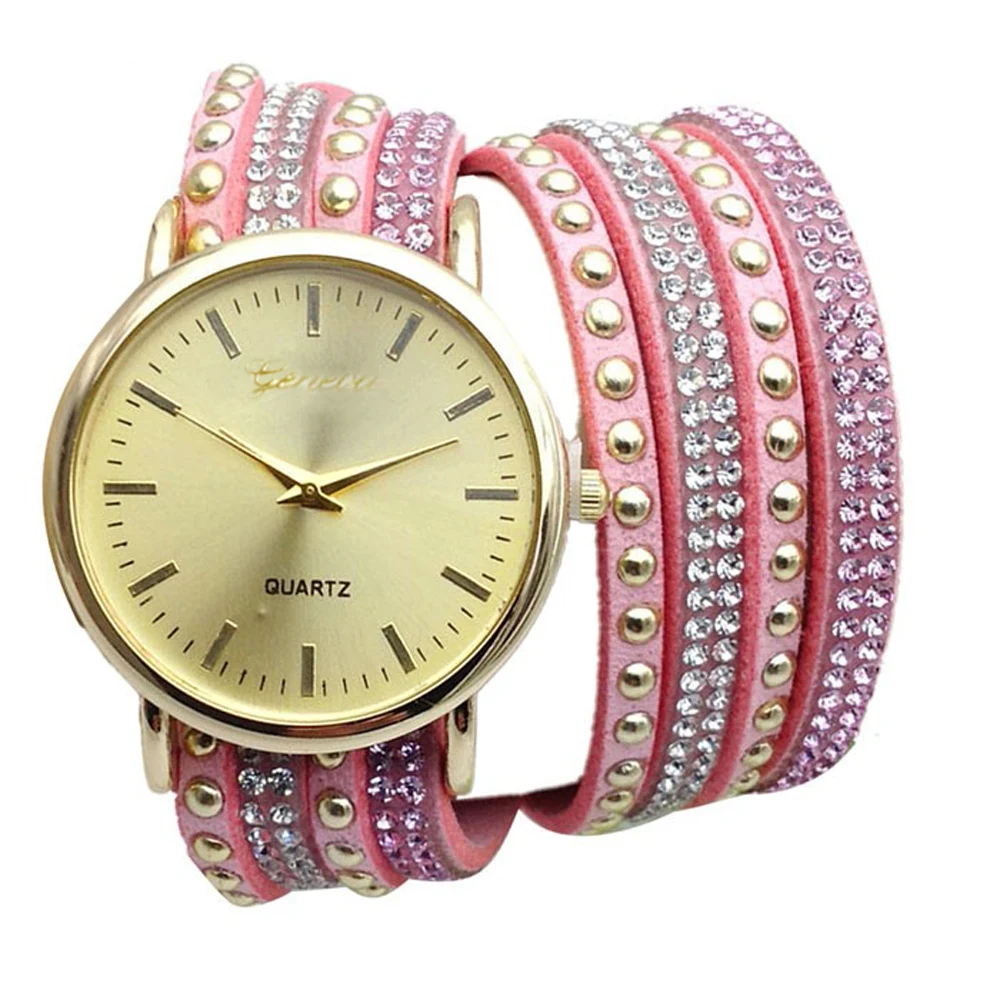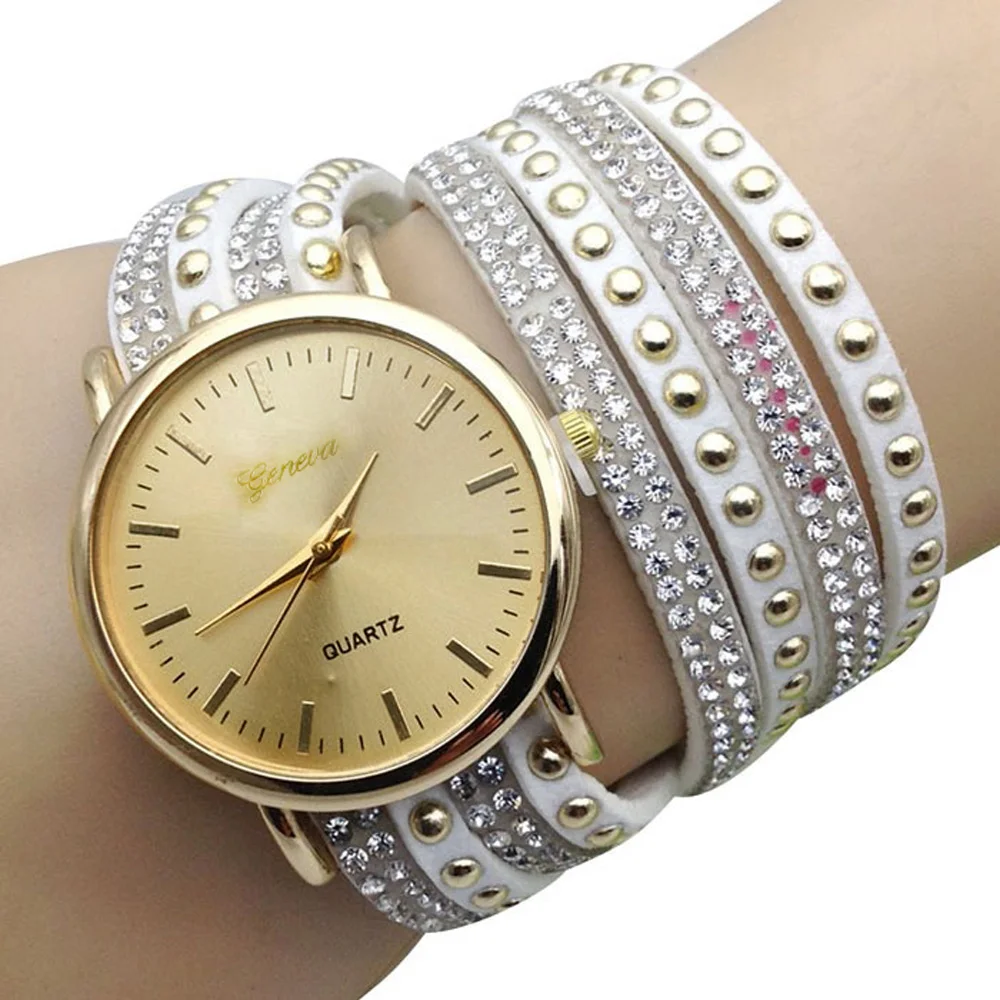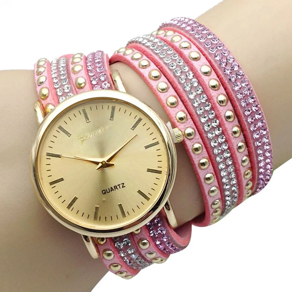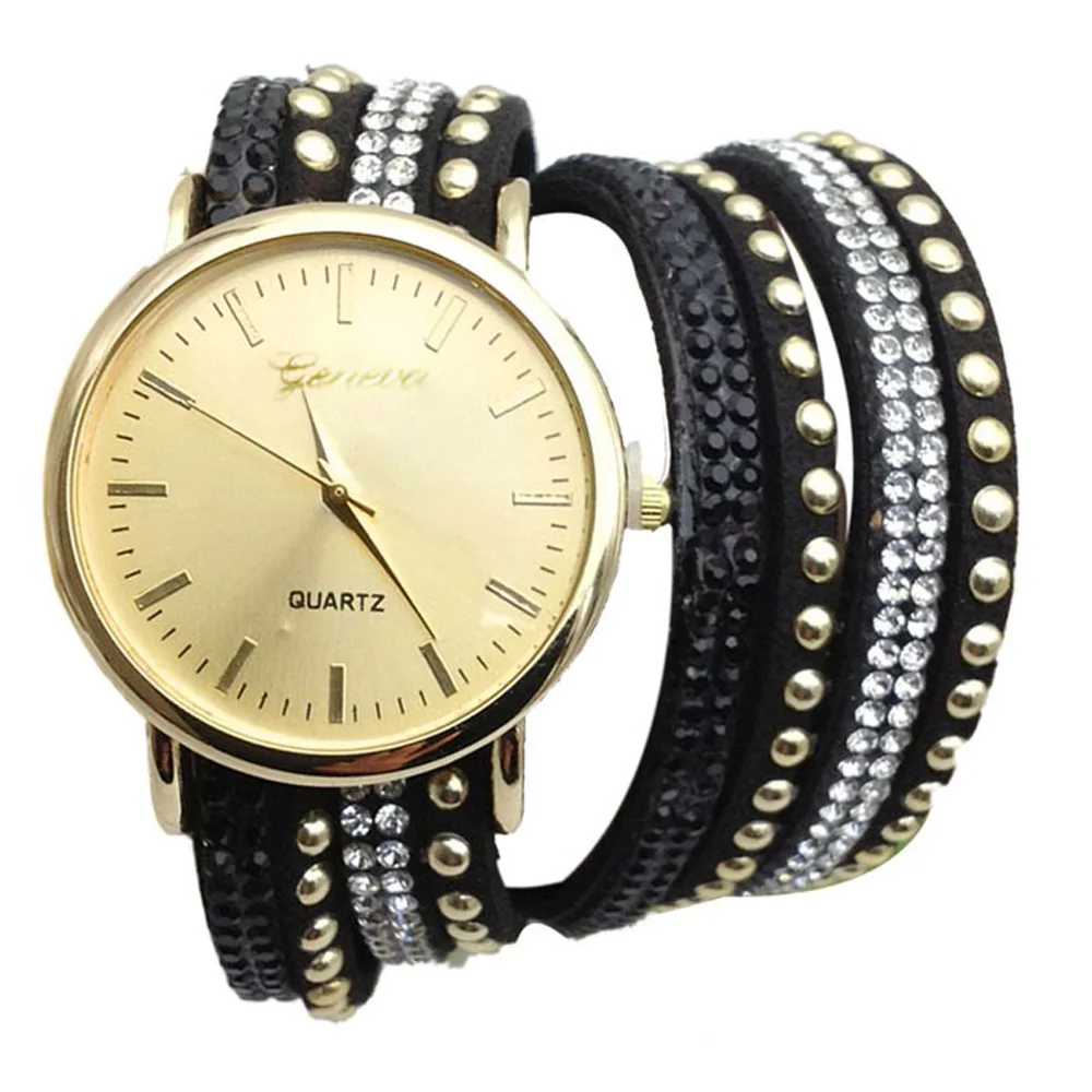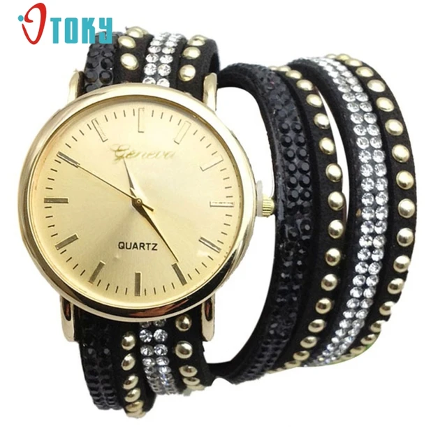 | [해외] 우수한 품질 9 새로운 캐주얼 여성 시계 PU 가죽 한국어 크리스탈 리벳 팔찌 시계 여자 여성 시계 마르 14 |