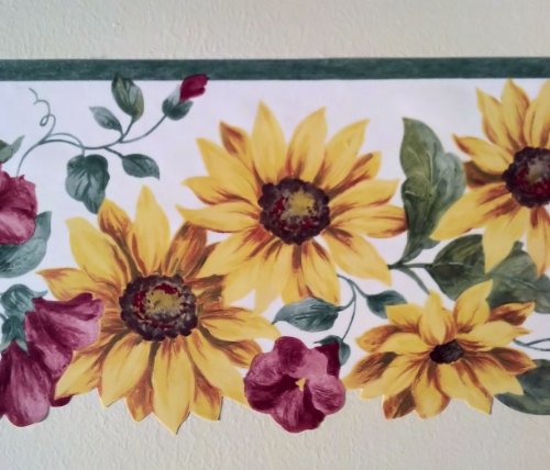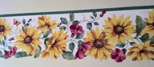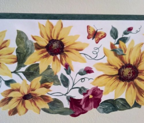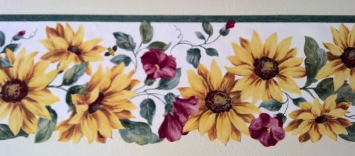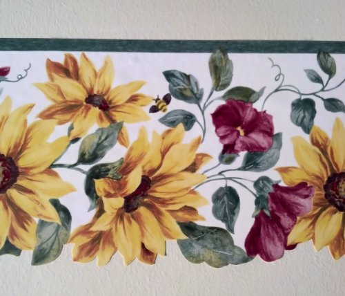 Wallpaper Border Sunflowers & Red Morning Glories with Green Vine on White