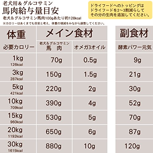 原材料:原材料:馬肉、コエンザイムQ10、タウリン、BCAA、 / 保証分析値(100g中) カロリー:128kcal、タンパク質 21g、脂肪 2.6g、ビタミンB2 0.24mg、鉄分 4.3mg、カルシウム 11mg