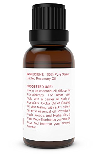 - Feature : AROMATHERAPY - AromaOils 100% Pure Therapeutic Grade Rosemary Essential Oil is used in Aromatherapy and is known for its fresh, strong, penetrating, and camphoraceous aroma. Our oil provides a purifying and uplifting energy to the room when used in a diffuser. When inhaled it will stimulate the circulatory system and improve overall body blood flow giving you more energy! / STRESS RELIEF - Our oil is used by many as a Stress Reliever - it will balance your intense emotions such as anger and depression and will help control dangerous mood swings. Manages anxiety with a powerful calming effect and will stimulate the mental cognitive process to help memory and focus. / DIY - This oil is very versatile. It can be used in many homemade, natural recipes for Hair Growth, Skin Care, Astringent, Facial Toner, Candles, Steam Bath, for Dry Skin, Cellulite, acne and eczema. It also helps with physical fatigue, asthma, bronchitis, painful menstruation, arthritis, gout, headache, muscular soreness, bruising, cramps, weakness of limbs, hair loss, premature greying, blemishes, insect repellant, sinusitis, colds, flu, inflammation and swelling. / PAIN RELIEF - Our Rosemary Oil contains the component Carnosol which is very effective against inflammation making our Oil a powerful additive to your Natural Pain Relief Cream. Add 5 drops of Rosemary, 5 drops of AromaOils Peppermint Oil to 2 Tsp of our AromaOils Castor Oil and apply to affected area. Effective for muscle spasm, joint pain, soreness and arthritis. / PREMIUM QUALITY - Our 100% Pure Steam Distilled Rosemary Essential Oil comes from the finest Rosemary Leaves of the Rosmarinus officinalis plant mainly from Spain. The steam distillation ensures that you receive the Full Natural Benefits of this oil and not a watered down version! This oil has Not been diluted with any additives or filler waste product and is Therapeutic Grade Quality Oil.