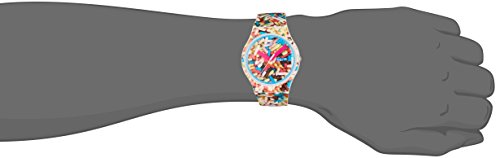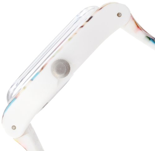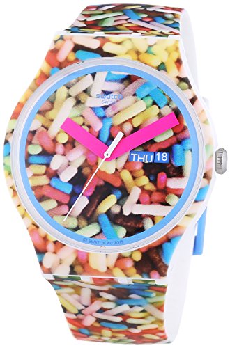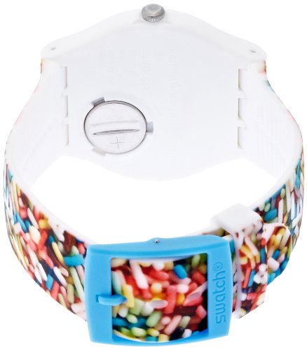 Plastic case with a sprinkle print silicone strap. Fixed blue and white bezel. Sprinkle print dial with pink hands. Dial Type: Analog. Day of the week and date display at the 3 o'clock position. Quartz movement. Scratch resistant plastic crystal. Pull / push crown. Solid case back. Case dimensions: 47.40 mm x 42.70 mm. Case thickness: 9.85 mm. Round case shape. Tang clasp. Water resistant at 30 meters / 100 feet. Functions: date, day, hour, minute, second. Casual watch style. Swatch Sprinkled Unisex Watch SUOW705.Feature