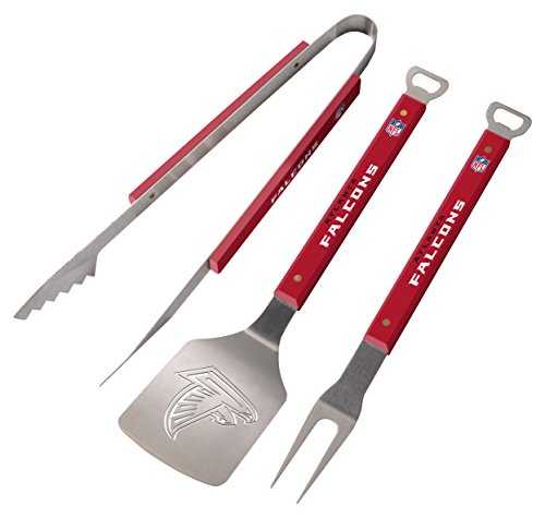Get your grill game on with an officially licensed set of Atlanta Falcons sportula barbecue tools. The barbecue tool set includes a sportula a pair of tongs and a grill fork. Each tool is made from heavy-duty stainless steel with brass-riveted handles. Atlanta Falcons is stamped on the handles and the team logo is laser cut through the blade of the sportula. The sportula and the fork both come with an integrated bottle opener. An unforgettable gift for any Atlanta Falcons fan and the most noticed accessory at any tailgating event.Feature