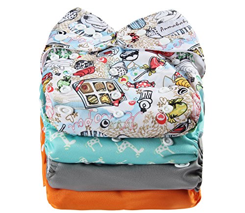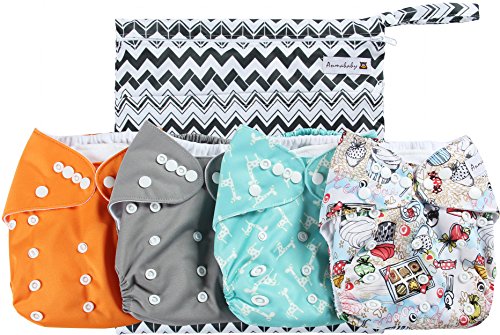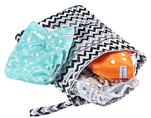 Anmababy 4 Pack Adjustable Size Waterproof Washable Pocket Cloth Diapers with 4 Inserts and Wet Bag