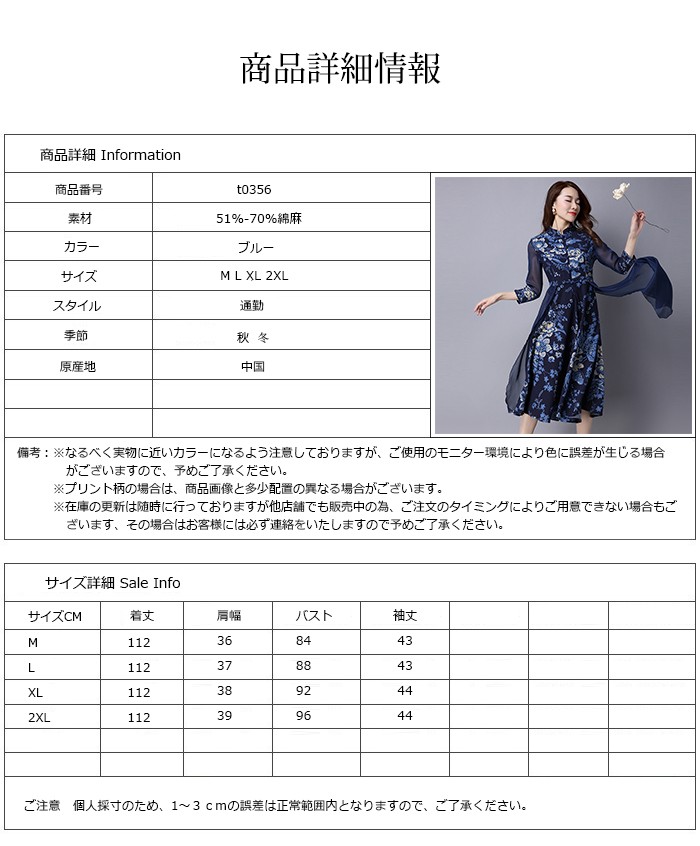 ■素材:ポリエステルなど ■カラー:写真色 ■サイズ:M 着丈112 肩幅36 バスト84 袖丈43 L 着丈112 肩幅37 バスト88 袖丈43XL 着丈112 肩幅38 バスト92 袖丈442XL 着丈112 肩幅39 バスト96 袖丈44■原産地:中国
