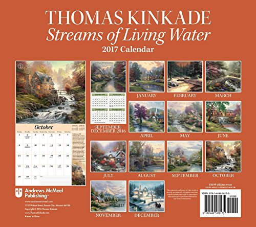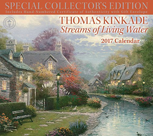 The Thomas Kinkade Special Collector's Edition 2017 Deluxe Wall Calendar, Streams of Living Water features a full-color image such as Lakeside Manor or Lamplight Bridge and thoughtful reflections by the artist on every monthly spread.