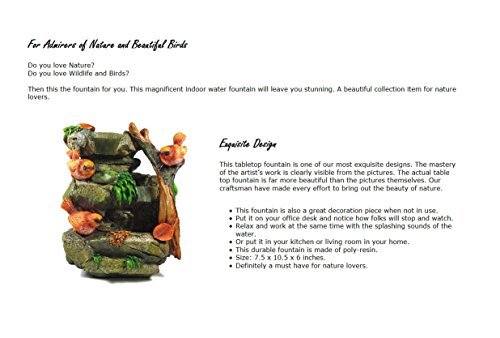 For Admirers of Nature and Beautiful Birds Do you love Nature? Do you love Wildlife and Birds? Then this the fountain for you. This magnificent indoor water fountain will leave you stunning. A beautiful collection item for nature lovers. Exquisite Design This tabletop fountain is one of our most exquisite designs. The mastery of the artist's work is clearly visible from the pictures. The actual table top fountain is far more beautiful than the pictures themselves. Our craftsman have made every effort to bring out the beauty of nature.