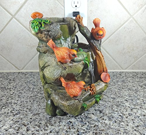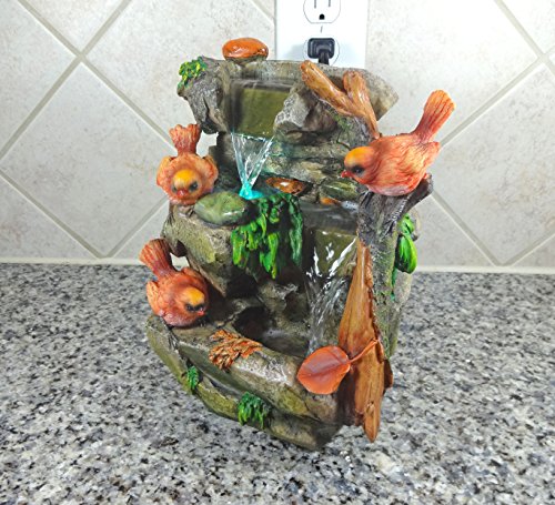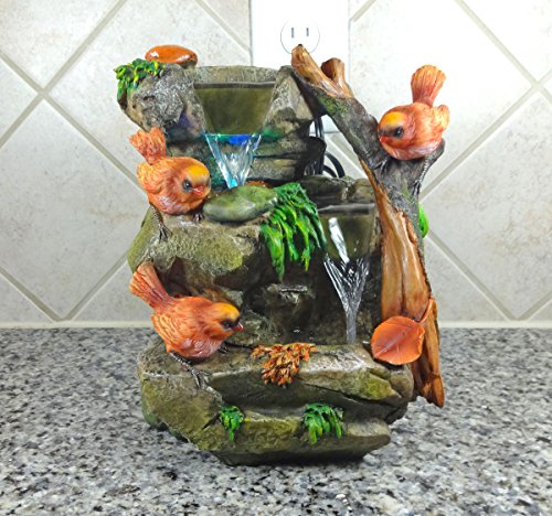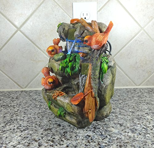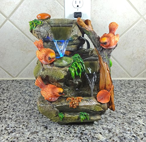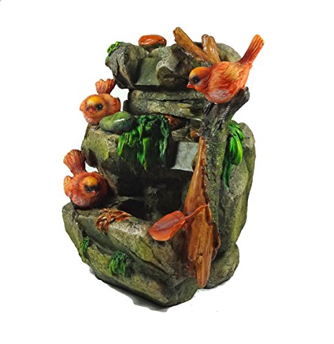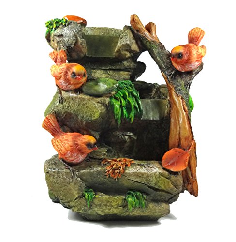 Waterfall The water in this fountain cascades from one stone formation to another and then ultimately into the pond. Three beautiful birds in the surrounding are looking at it. Two are sitting on the rocks and one on a tree branch. LED Lights The fountain includes color changing 4 LED lights to set the mood. The LED lights are embedded behind the rock and under the fall and reflect beautiful colors on the falling water. Notice the details of the tree bark and texture. Realistic Life like Design Magnify the pictures at the top and see the attention to the minute details the artist has paid to in this classic fountain. Note the texture of the branch, curves and edges. Also note the moss on the branch and texture. Colors of Nature Note the colors of the rock formation and surrounding area. You can also see some grass on the rocks.