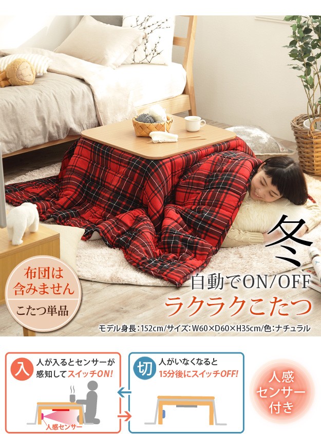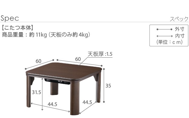 ※メーカー直送のため代金引換はお受けできません。※沖縄・一部離島は別途送料がかかります。お見積もりいたしますのでお問い合わせ下さい。【カラーバリエーション】ブラウン・ナチュラル【仕様】天板:繊維板(木目転写)脚部:天然木(ラバーウッド)【人感センサー付】ファンレス石英管ヒーター(400W・中間スイッチ式)コード長さ:約3m◎一部組立(脚部取付)【サイズ】幅60x奥行60x高さ35cm重量:約11kg天板サイズ:幅60x奥行60cm・厚み15mm・4kg脚間:44.5/44.5cm中天板下高さ:31.5cm株式会社ナカムラ(G0100235)