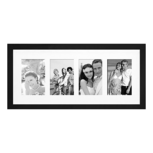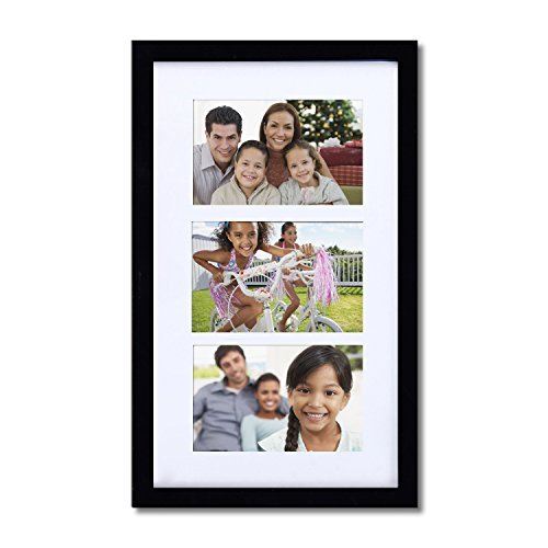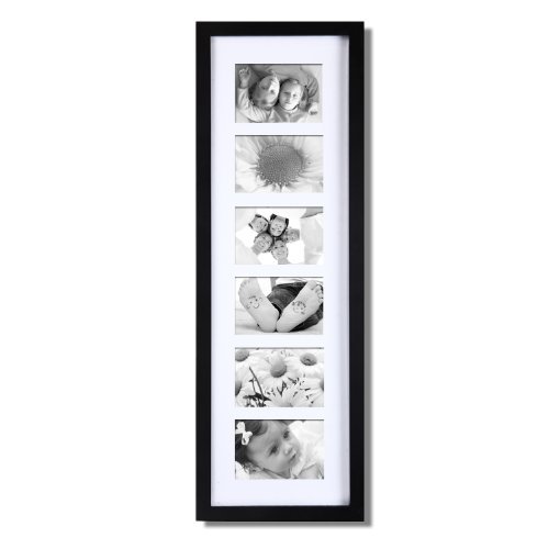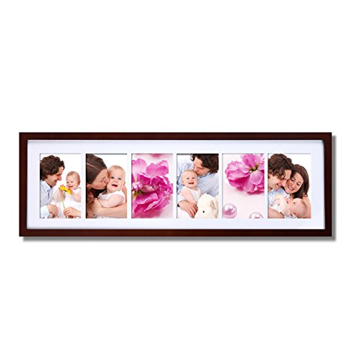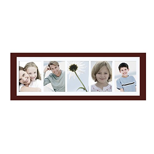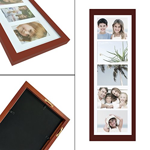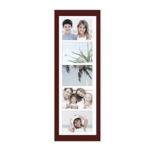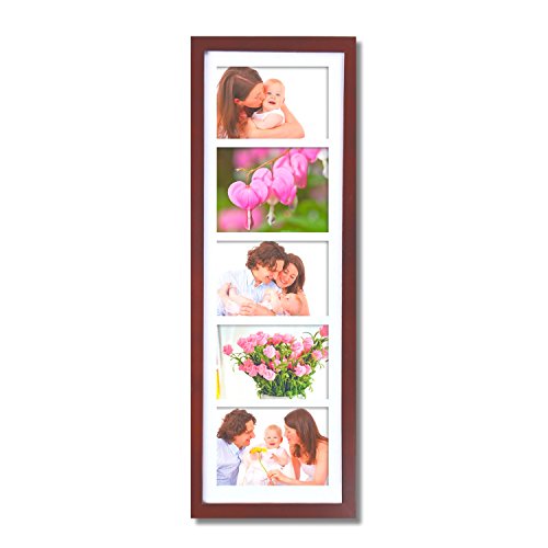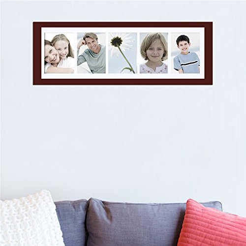 This simple, multi-photo frame is a great addition to the living room or bedroom. The walnut-color finish will provide a bold contrast to a black and white collage of family photos, or form a striking border for a collection of full-color images. With space for five 5x7" photos and the option to hang horizontally or vertically, you have the freedom to display a timeline of child birthdays, a series of wildflowers, or a combination of your favorite shots. The white mat gives your special memories a professional look. Order a few for birthday or wedding gifts, or create a different, eye-catching collage for every room of the house.Feature