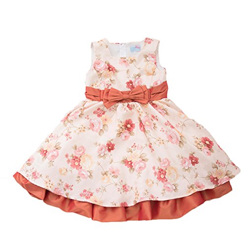 This classical rose print dress has matching color ruffle hemline under below-the-knee skirt and waist ribbon to tie in back. Sleeveless bodice has a cute bow at front and zipper back closure. Skirt is with tulle underneath. Hand wash in cold water. Do not bleach.