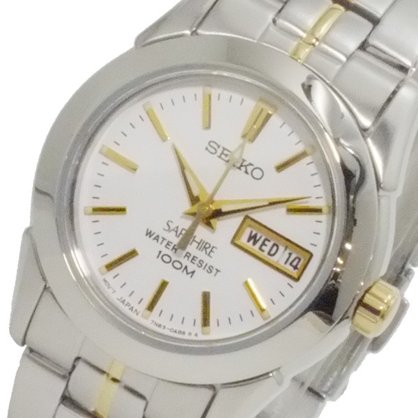 仕様クオーツ、100M防水、カレンダー(日付、曜日)、カラー:ホワイト(文字盤)、シルバー×ゴールド(ベルト)