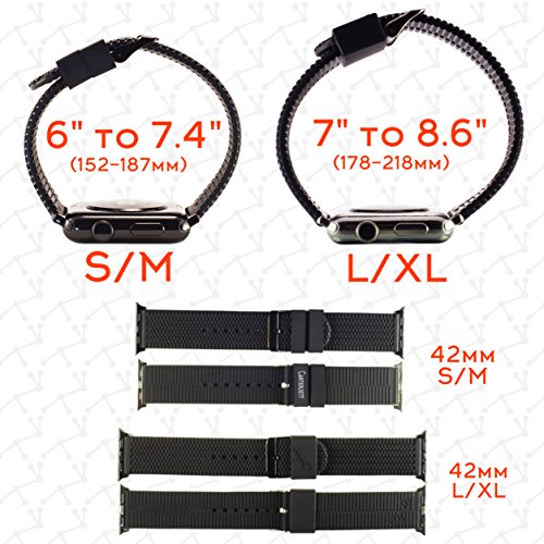 SIZE MATTERS! Our modern 1 inch wide wristband fits wrist sizes 6 - 7.4 inches. This compares to the S/M Apple Sport Watch Band 42 mm. If you wore the M/L size, please choose our men’s LG/XL (fits 7-8.6 inches)