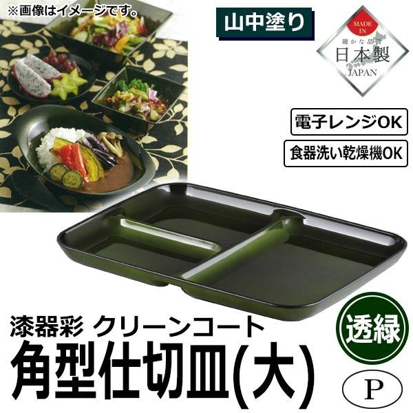 撥水性が高く汚れがつきにくいクリーンコート加工の角型仕切皿です。 製造国:日本 素材・材質:飽和ポリエステル樹脂・ABS樹脂ウレタン塗装 商品サイズ:約幅260×奥行190×高さ25mm 仕様:電子レンジ使用可食器洗い乾燥機使用可 ※サプライヤー直送品 ご注文後2~3営業日後の出荷となります【商品名】パール金属 漆器彩 クリーンコート 角型仕切皿大 透緑 K-6150