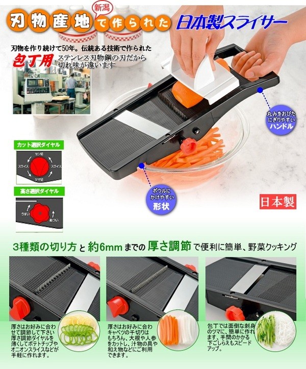【商品名】日本製スライサー 切り方3種類(スライス・千切り・ツマ切り)/厚さ調整可 安全ホルダー付き