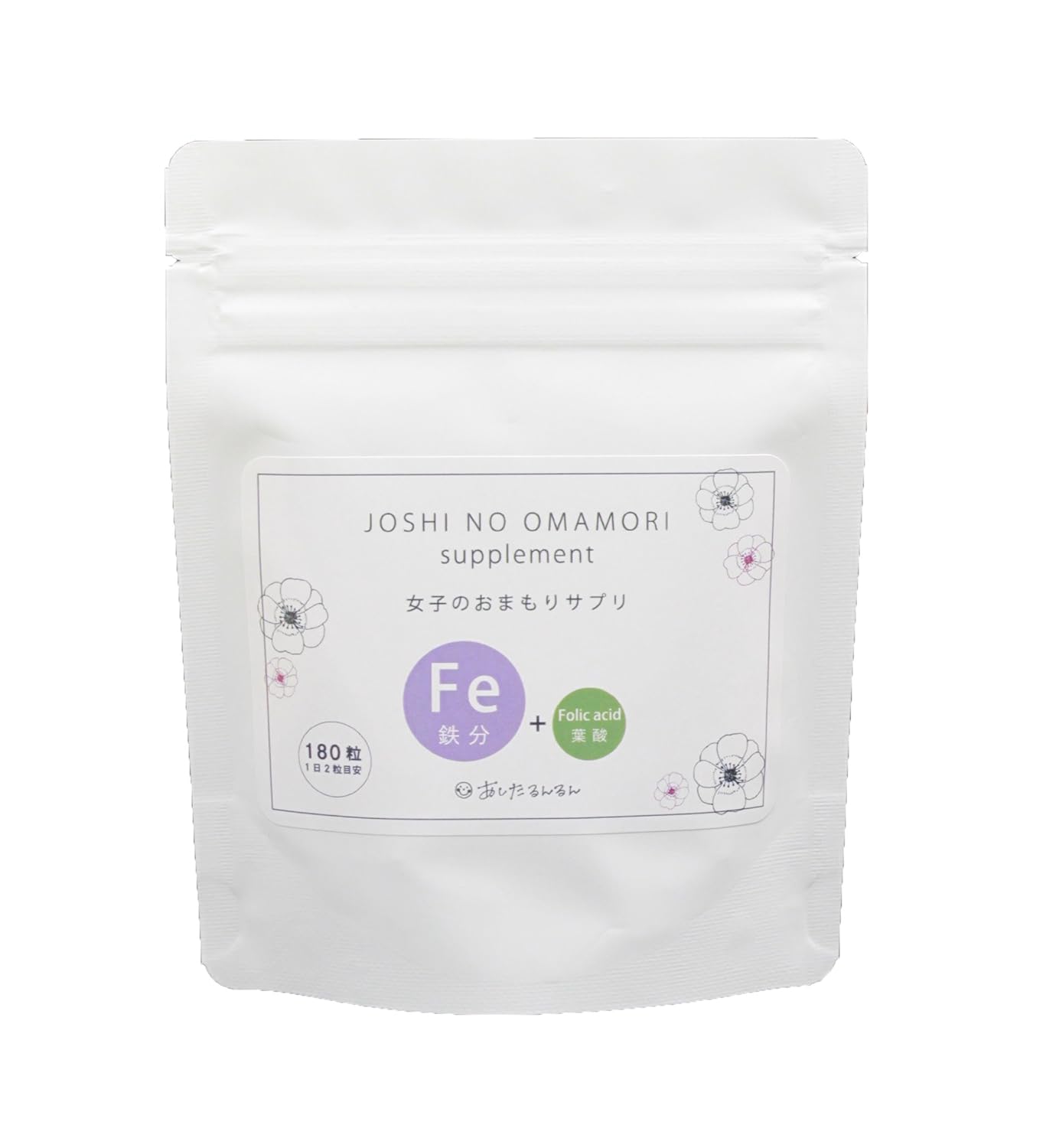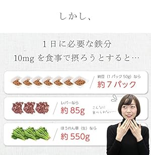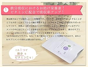 - 含有量(1日摂取目安 2粒あたり):エネルギー0.95kcal、たんぱく質0.05g、脂質0.05g、炭水化物0.43g、食塩相当量0.01g、鉄10mg、ビタミンB61.64mg、ビタミンB12 2μg、ビタミンC100mg、葉酸200μg