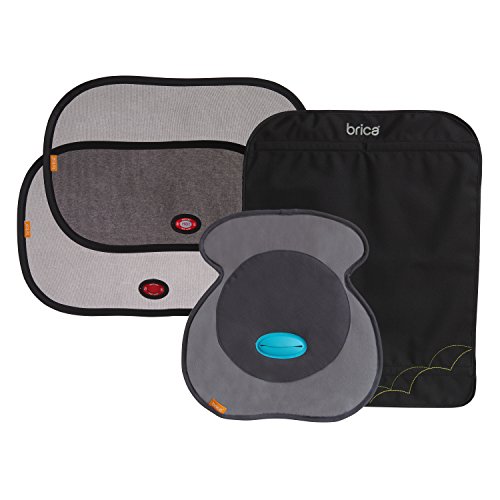 Toddler Travel Peace of Mind Car Kit includes (1) Seat Saver piddle pad, (1) Deluxe Kick Mat and (2) Pop Open Cling Shades with temperature sensor (each shade measures 13.75" x 20")