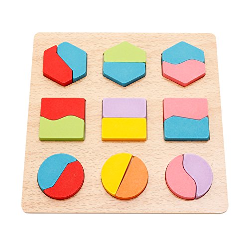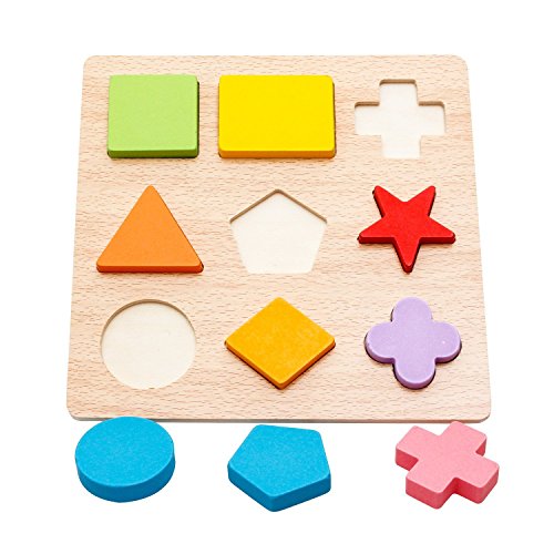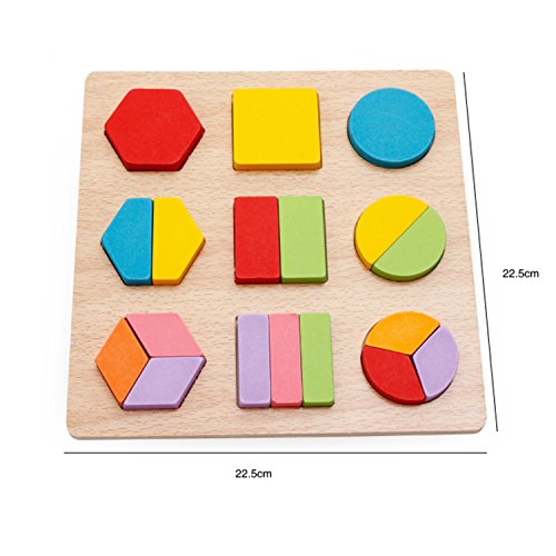 Chunky size pieces with a smooth finish that will fit nicely into little hands. Each piece is well shaped and easy enough for a toddler to pick up, rotate and handle. Size of board is 8.7 x 8.7x 0.3inches or 22cm x 22cm x 0.8cm