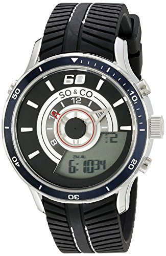 -. Binding : Watch -. Brand : SO&CO New York -. Department : mens -. EAN : 0847988065252 -. Feature : Polished round case with black numbered bezel on a black tire-tread design silicone rubber strap with white contrast stitching / Black dial with stick-style markers, Arabic numerals on inner ring, and digital multifunction display from 3:00 to 7:00 position / Quartz Movement / Case Diameter: 45mm / Water Resistant To 330 Feet -. Label : SO&CO MFG -. Manufacturer : SO&CO MFG -. Model : 5035.1 -. MPN : 5035.1 -. PackageQuantity : 1 -. PartNumber : 5035.1 -. ProductGroup : Watch -. ProductTypeName : WATCH -. Publisher : SO&CO MFG -. Studio : SO&CO MFG -. Title : SO&CO New York Men's 5035.1 Monticello Analog-Digital Display Quartz Black Watch -. UPC : 847988065252