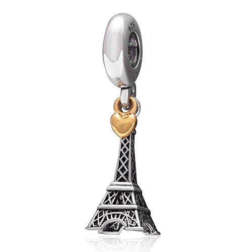 Eiffel Tower Charms 925 Sterling Silver and 18K Gold Heart Dangling Charm for European Bracelet Necklace