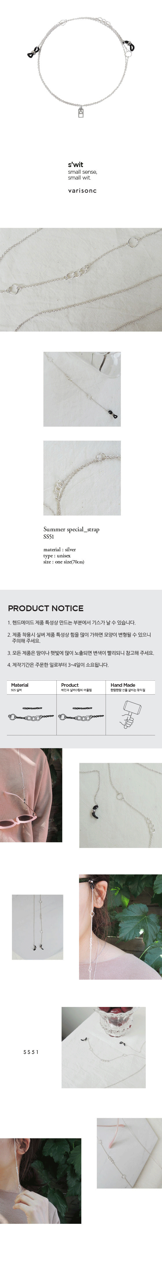 - 주문시 유의사항 : 모든 제품은 핸드메이드이므로 약간의 오차가 발생될 수 있습니다. 모든 금속제품은 시간이 지남에 따라 자연스럽게 변색 됩니다. 제작기간은 2~3일 정도의 시간이 소요되며, 제품의 부자재 유무에 따라 최대 5일까지 소요되는 경우도 있습니다. - 제주 및 도서산간 지역은 추가배송비(3,000원)가 부과됩니다. 여름 시즌상품으로 새롭게 나온 선글라스 줄 입니다. 때로는 포인트 목걸이로, 때로는 소중한 선글라스를 지켜줄 스트랩으로 스타일을 업그레이드 해보세요. 서로 다른 모양의 2가지 체인과 실버 동그라미가 연결된 실버 선글라스/안경 스트랩입니다.