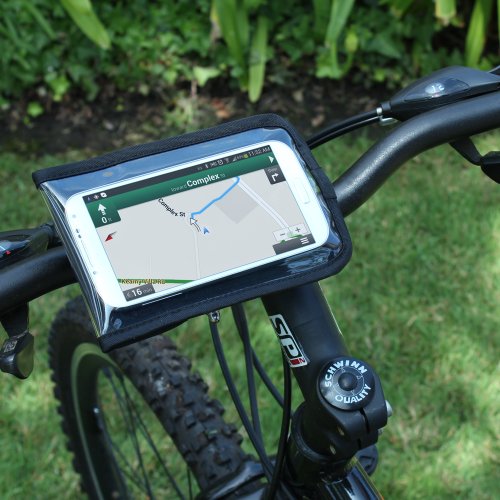 The mount fits bicycle handlebars 0.79" - 1.43" in diameter and the pouch fits smartphones up to 6.3" x 3.5".