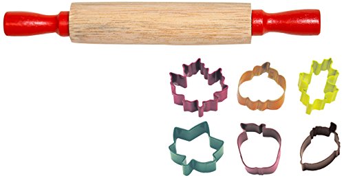 Vibrantly colorful set of cutters that inspires creativity. Cutters are made of durable, kiln-fired polyresin-coated tinplate steel. Finish is stain- and chip- resistant and dishwasher safe (top rack). The designs are detailed. Includes a kid-sized, wooden rolling pin and recipes for fun-dough and sugar cookies. Makes a great gift. Shipped in a clear-topped box.Feature
