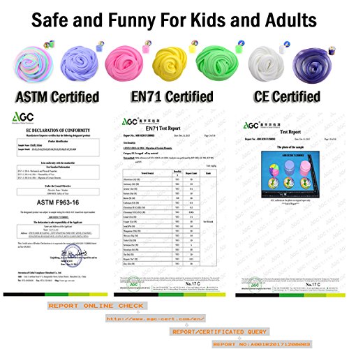 Safe & Non Toxic -- It is nonirritating to the skin or eyes and non-toxic in case of ingestion. Absolutely cannot eat , do not recommend too small children to play,Suitable for children over the age of 6. We sales security certification products all the time with high quality and without any hurt material. This fluffy slime is super stretchy, soft, fluffy and fun to play with! Less Sticky,so no worry of slime sticking your hands.