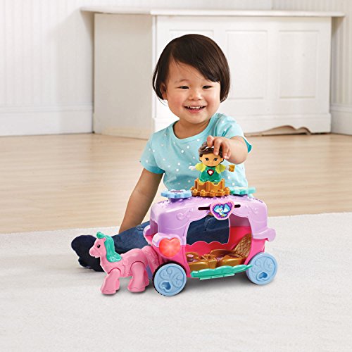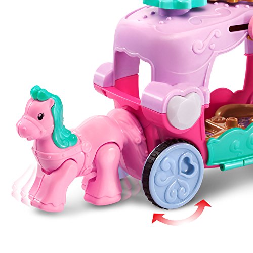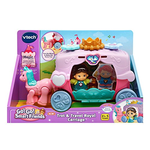 Go for a magical ride with the Go! Go! Smart Friends Trot and Travel Royal Carriage by VTech. This regal carriage is pulled by an adorable pink horse that trots when you push it. Join Princess Lela for a ride by placing her on the MagicPoint location to learn about her. The MagicPoint also triggers a color-changing light on the carriage. The carriage features a spinning crown and flowers, a sliding bird and a carriage door that opens and closes. Create a whole kingdom with princesses, princes, magical creatures and more with Go! Go! Smart Friends characters and playsets (sold separately). Requires 2 AAA batteries (batteries included for demo purposes only, new batteries recommended for regular use). Toy carriage is intended for ages 18 months to 5 years.Feature