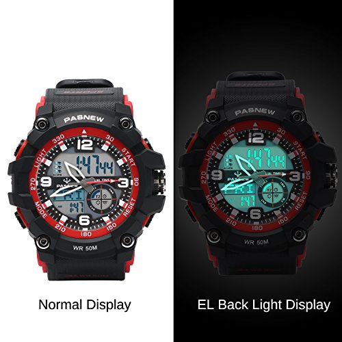 This waterproof watch with analog and digital display has a durable PU band, stainless steel back and EL backlight for the night. It is lightweight and very comfortable to wear.