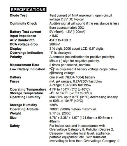 - Multimeter has 8 functions, manual ranging and 20 ranges for high accuracy