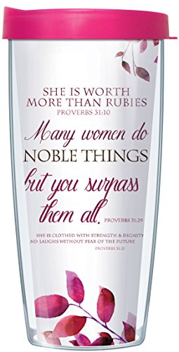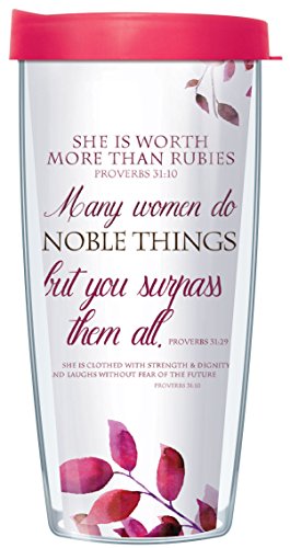 Our double-walled technology allows your beverage to maintain it's temperature longer, helping hot drinks stay hot and cold drinks stay cold! Signature Tumblers are virtually indestructible. They won't crack or shatter! Our tumblers are safe anywhere in the kitchen. Conveniently clean them using the dishwasher, or quickly reheat in the microwave.Our tumblers are proudly made in the USA! Signature Tumblers use double-walled technology to greatly reduce the amount of condensation. No need for a coaster! Lid included. Lifetime guarantee. Featured scripture: Proverbs 31:10 She is worth more than rubies. Proverbs 31:25 She is clothed with strength and dignity and laughs without fear of the future. Proverbs 31:29 Many women do noble things, but you surpass them all.Feature