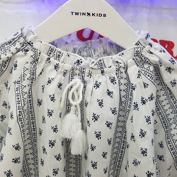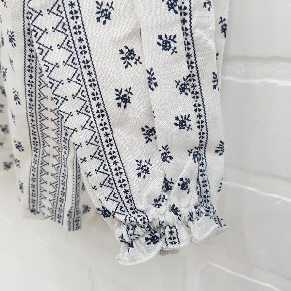 면 트윌 북유럽 스타일의 블라우스로 목부분과 소매끝에 밴드를 넣어주어 착장이 편하도록 해줌 앞 수술장식이 포인트