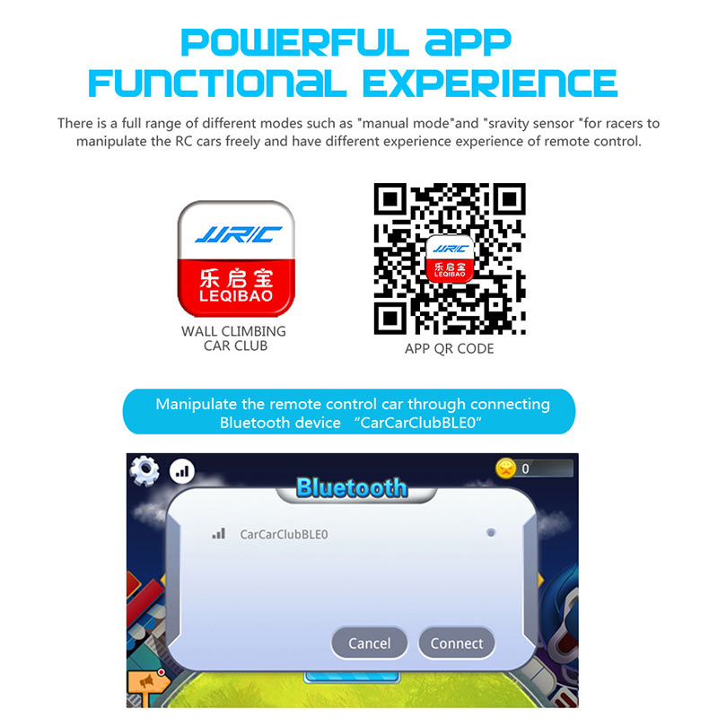 This mini bluetooth RC wall climbing car can be controlled by your phone with particular APP we provide. This APP provides 2 control modes, including manual control, gravity sensor. It can running on any smooth surface, such as wall, glass, ceiling, floor. In addition, superb functions and sound effects will bring you special enjoyment. Moreover, Super cool shape and lightweight body is given to this car. Nothing is impossible in your hand. Come on and have an experience as driving a real car, I bet children must be like it!