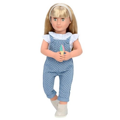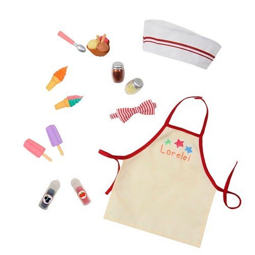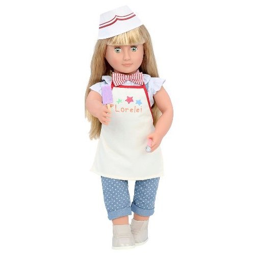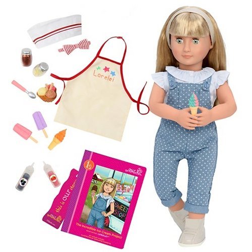 What makes life sweet? lot's of caring, always sharing and a little treat! the "Our Generation" 18" Lorelei doll is Super sweet and will make a great friend to your little one. Includes: 1 poseable doll, 1 pair of overalls, 1 shirt, 1 pair of undies, 1 headband, 1 pair of shoes, 1 apron, 1 serving hat, 1 bow tie, 1 scoop waffle ice cream, 2 soft serve ice cream cones, 2 popsicle, 2 syrup bottles, 2 sprinkle shakers, 1 ice cream scooper, 1 storybook and 1 bookmark. For ages 3+