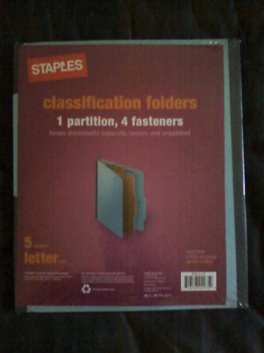 -. Title : Staples Classification Folders - letter size, light blue, 1 partition, 4 fasteners, 5 pack